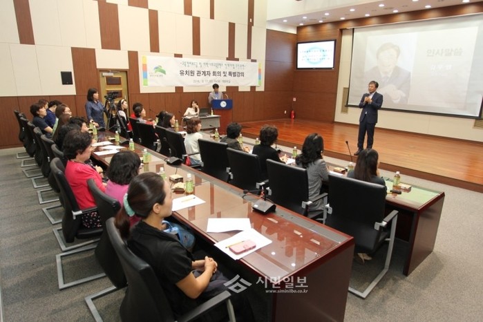 지난 17일 지역내 50개 유치원 원장, 원감, 교사를 대상으로 서울 은평구청 대회의실에서 열린 강의에서 김우영 구청장이 유치원 관계자 회의 및 ‘섬김의 리더십’에 관한 내용의 특별강의를 펼치고 있다. (사진제공=은평구청)