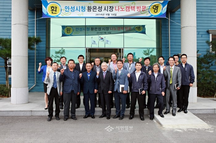 황은성 경기 안성시장은 최근 '5백만불 수출탑'을 수상한 나노캠텍(주)을 방문해 애로사항을 듣고 해결방안을 모색했다. 사진은 황 시장이 현장방문 후 기업관계자와 함께 기념촬영한 모습. (사진제공=안성시청)