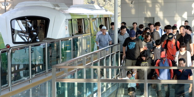 용인경전철 수도권 통합환승할인이 시작된 20일 용인시 기흥구 구갈동 기흥역 경전철에서 분당선 환승 통로로 향하는 이용객들이 북적이고 있다. 환승 할인이 되면 용인 경전철의 요금은 기존 1300원에서 1250원으로 50원 할인되고 어린이는 50%, 청소년은 20% 할인된다. 국가 유공자 및 장애인, 65세 이상 어르신은 무료로 탑승 가능하다.