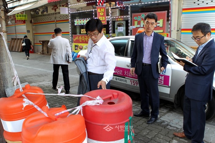 이흥수 인천시 동구청장(가운데)이 구민과 소통하는 열린 행정 구현을 위해 지역내 곳곳을 방문해 상황을 살핀 후 도로 적치물과 무단 투기 쓰레기, 파손보도 등이 즉각 정비될 수 있도록 조치할 것을 당부하고 있다. (사진제공=동구청)