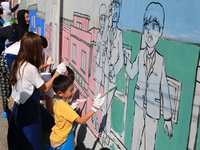 지난 19일 서울 중구 광희동 남소영길 끝자락에 위치한 중구 퇴계로 310의 남영상사의 가로 30m, 세로 4m벽에 자원봉사자 50여명과 화가 정동준씨의 재능기부로 ‘예술 벽화’의 채색작업이 실시됐다. (사진제공=중구청)