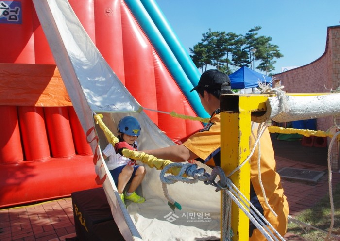 최근 경기 양주소방서는 양주시 고읍동 나리공원에서 열린 '양주 목화 페스티벌 축제장'에서 '119소방안전체험캠프'를 운영했다. 사진은 이날 체험캠프를 방문한 아이들이 '종합피난체험기구'에서 재난 발생시 대처방법을 체험하는 모습. (사진제공=양주소방서)