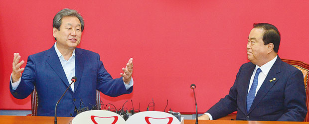 22일 오후 서울 여의도 국회 새누리당 대표최고위원실에서 새누리당 김무성(왼쪽) 대표와 새정치민주연합 문희상 비상대책위원장이 만나 환담을 나누고 있다.