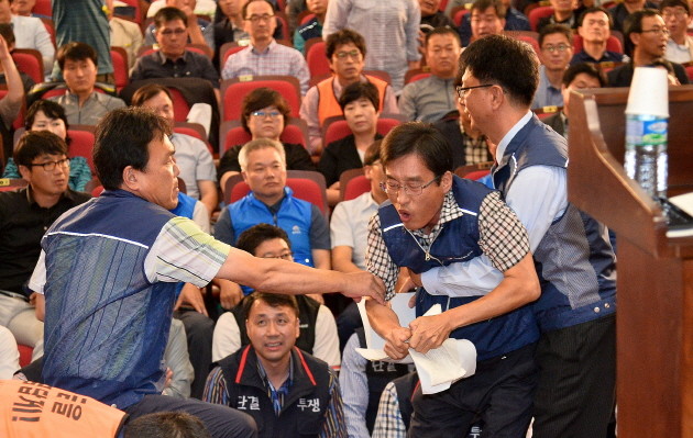 22일 오전 서울 여의도 국회 의원회관에서 한국연금학회 주최로 열린 '공무원연금 개혁을 위한 정책토론회'에서 전국공무원노조가 정부와 여당을 규탄하며 항의하고 있는 가운데 한 조합원이 토론회 자료집을 찢으며 항의하고 있다. 이날 토론회는 정상적인 진행이 불가능하다고 판단해 주최 측이 무산시켰다.