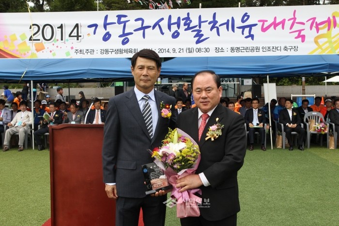지난 21일 서울 강동구 동명근린공원에서 열린 '2014 강동구생활체육대축제'에서 강동구의회 김용철 부의장이 강동구 생활체육 발전을 위해 노력한 공로를 인정받아 강동구 생활체육회로부터 감사패를 전달받았다. 사진은 감사패 전달식에 참여한 김 부의장(오른쪽)과 송영환 강동구생활체육회 회장. (사진제공=강동구의회)