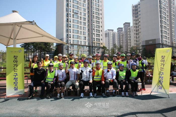 이해식 서울 강동구청장은 지난 22일 고덕천 자전거도로에서 '강동 바이크 스쿨' 수료생 및 교육생, 강사 등 참석자 25명과 고덕천 자전거 도로를 따라 총 5.2km를 주행했다. 사진은 이 구청장(앞줄 가운데)과 '강동 바이크 스쿨' 관련 참가자들이 자전거 주행이 끝난 후 기념촬영한 모습. (사진제공=강동구청)