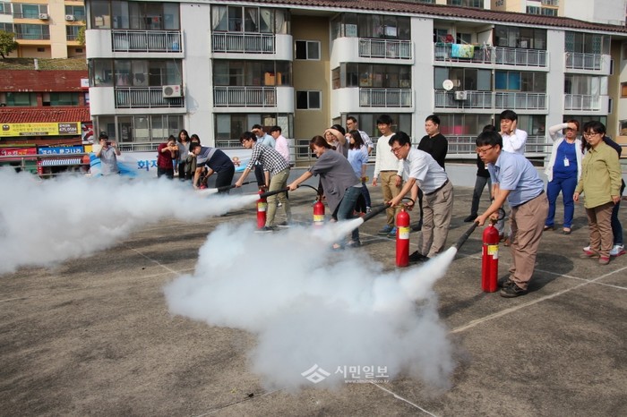 23일 경북 구미소방서와 삼성전자 'Mold안전지킴이 봉사단'이 함께 구미종합사회복지관을 방문해 사회복지사 50명을 대상으로 '소방안전교육'의 하나인 소방기 사용 실습체험을 실시하고 있다. (사진제공=구미소방서)