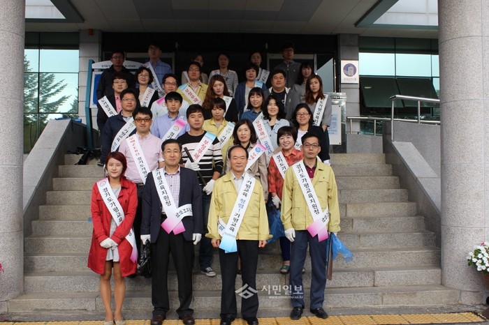 경기 가평교육지원청은 23일 오전 주변과 인근학교 통학로를 중심으로 간부 및 직원 30여명이 청렴캠페인과 더불어 환경정화 활동을 실시했다. 사진은 이날 캠페인에 참여한 공직자들이 환경정화 활동에 앞서 기념촬영하는 모습. (사진제공=가평교육지원청)
