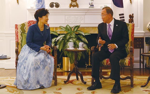 박근혜 대통령이 22일(현지시각) 반기문 유엔(UN) 사무총장 관저에서 반 사무총장과 만나 환담하고 있다.