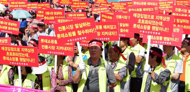 경기 수원지역 22개 전통시장 상인들로 구성된 수원시상인연합회원 1000여명이 23일 오전 경기 수원역 광장에서 롯데몰 경기 수원점 개장에 항의하는 집회를 열고 롯데쇼핑몰 철수를 요구하고 있다.