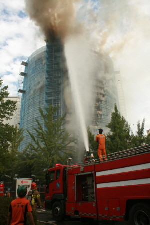 지난 23일 오후 3시59분쯤 경기 안양시 평촌동 평촌신도시 열병합발전소인 GS파워 축열조에서 불이 나 출동한 소방관들이 진화하고 있다.