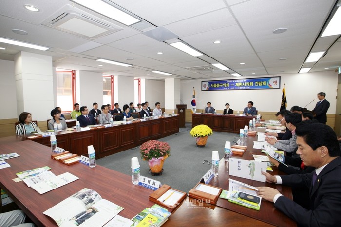| ▲ 중구의회가 제천시의회를 방문해 지난해 체결한 교류협력 협약식에 이어 양지역 발전을 위한 간담회를 실시하고 있다. (사진제공=중구의회) | ||