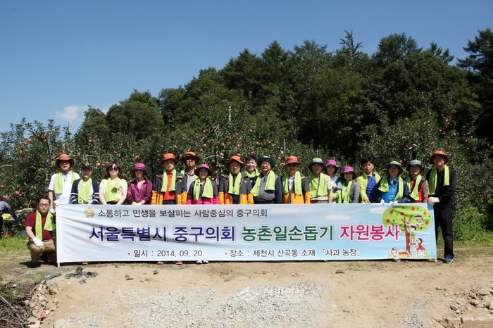 | ▲ 중구의회가 제천시를 방문, 도·농교류 협력방안의 일환으로 산곡동 농가에서 사과수확 및 포장 등의 농촌일손돕기 봉사활동을 펼치고 기념촬영을 하고 있다. (사진제공=중구의회) | ||