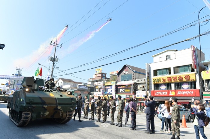 지난 20일 경기 포천시 일동면 기산리와 일동중·고등학교에서 제8기계화보병사단과 일동면 주민이 서로 이해하고 상생하기 위한 '제8회 포천일동 오뚜기 한마음축제'가 열려 카 퍼레이드, 육군 항공단 축하비행 등이 진행됐다. 사진은 카 퍼레이드와 축하비행이 진행 중인 모습. (사진제공=포천시청)