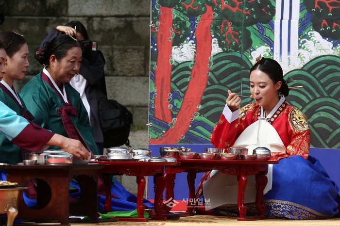 지난 23일 서울 종로구가 창덕궁 낙선재에서 개최한 '2014 조선시대 궁중음식전- 궁중음식 낙선재로 돌아오다' 행사에서 상궁들이 고종황제에게 수라를 바치는 모습을 재현하고 있는 가운데 왕비역을 맡은 탤런트 안연홍씨가 음식을 맛보고 있다. (사진제공=종로구청)