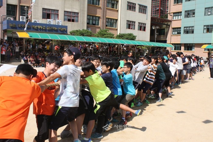 경기 부천시 상인초등학교에서는 25일 1500여명의 초등학생과 관련 학부모들이 '2014학년도 상인어린이 놀이한마당'에 참석한 가운데 학생, 학부모, 교사들이 모두 함께 어우러져 다양한 프로그램을 진행했다. 사진은 놀이 한마당에 참여한 학생들이 청·백팀으로 나뉘어 줄다리기를 하는 모습. (사진제공=부천교육지원청)