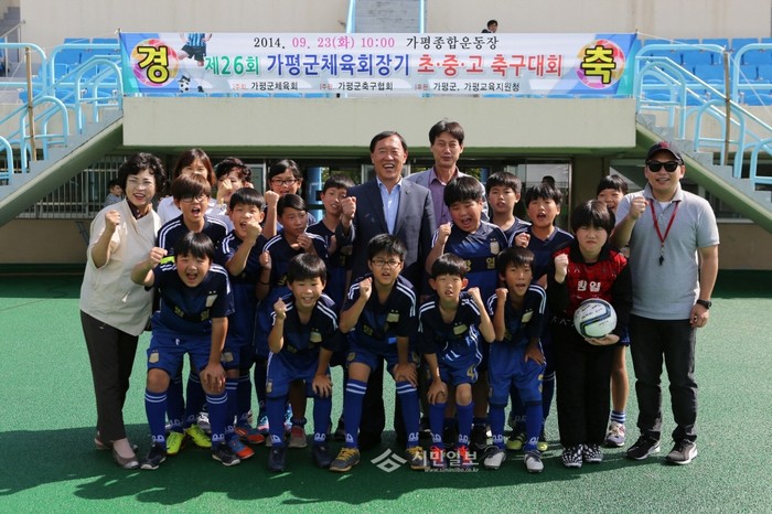 지난 23일 김성기 경기도 가평군수는 가평군체육회가 주최하고 가평군축구협회가 주관하는 '제26회 가평군체육회장기 초·중·고 축구대회'에 참석해 "선의의 경쟁을 펼치고 더불어 꿈을 실현하는 데 한 발짝 더 나아가는 기회가 되기를 바란다"고 말한 후 초등부 선수들과 기념촬영을 하고있다. (사진제공=가평군청)