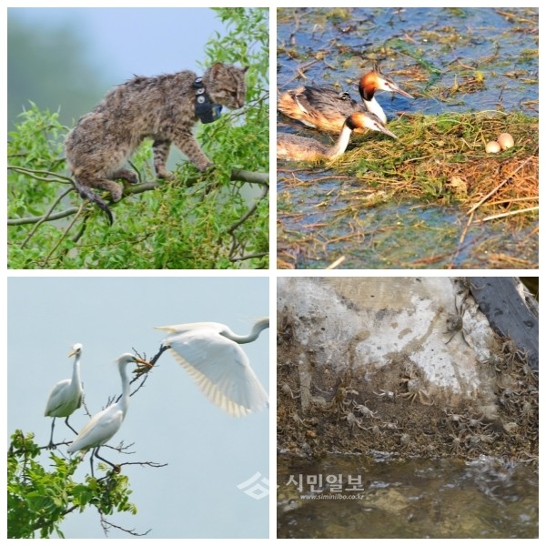 | ▲왼쪽부터 멸종위기종 고양잇과 동물 삵, 뿔논병아리, 천연기념물 노랑부리저어새(제205호), 참게 떼의 모습. | ||