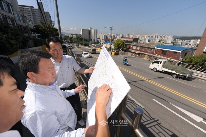 나진구 서울 중랑구청장이 지난 25일 지역내 마을버스 신청노선 현장을 방문했다. 사진은 나 구청장이 현장답사 중 도면을 들고 관계자들과 논의하고 있는 모습. (사진제공=중랑구청)