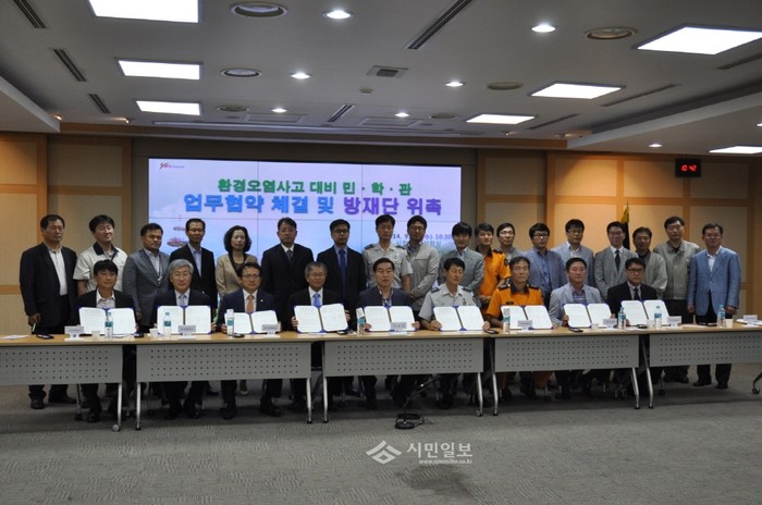 경북 구미시는 지난 24일 구미시청 3층 상황실에서 환경오염사고를 대비해 관련기관, 대학교, 관련단체, 방재업체가 참석한 가운데 민·학·관 합동방재단 업무협약을 체결하고 18명의 방재단을 위촉했다. 사진은 민·학·관 합동방재단이 업무협약 체결 후 기념촬영을 하고 있는 모습. (사진제공=구미시청)