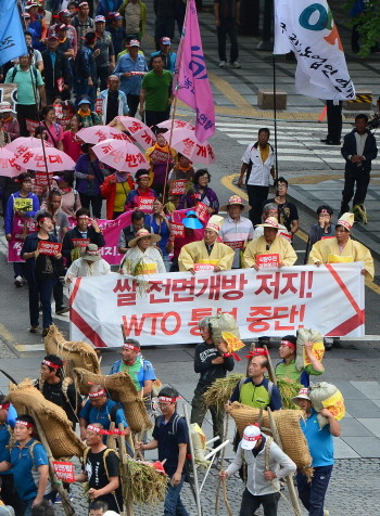 27일 오후 서울 중구 시청 서울광장에서 '쌀 전면개방 저지!WTO통보중단! 식량주권과 먹거리 안전을 위한 2차 범국민대회'를 마친 농민들이 '쌀 전면개방 저지' 플랜카드를 들고 을지로 방향으로 행진하고 있다.
