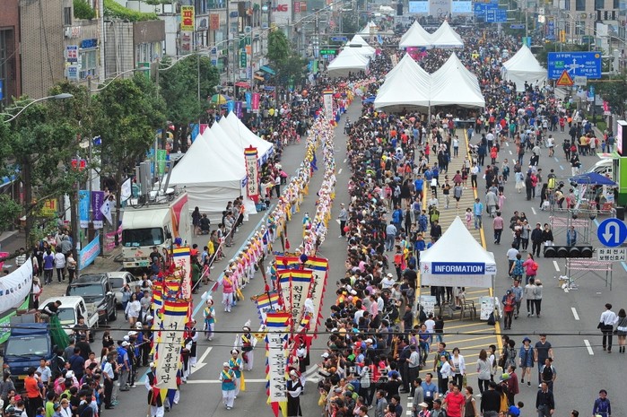 지난 28일 인천시 부평구청 어울림과장에서 열린 '원 아시아(One Asia) 인천부평풍물축제' 행사의 일환으로 부평구 부평대로에서 펼쳐진 '거리축제'에 참가한 축제 공연팀과 시민 퍼레이드단 등 1000여명이 대규모 퍼레이드를 하고 있다. (사진제공=부평구청)