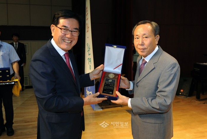 서울 동대문구는 지난 26일 오후 4시 구청 2층 강당에서 '제23회 동대문구민의 날 기념행사'를 개최했다. 사진은 유덕열 동대문구청장이 자랑스런 구민상 대상을 받은 김승실씨에게 상을 수여하고 있는 모습. (사진제공=동대문구)
