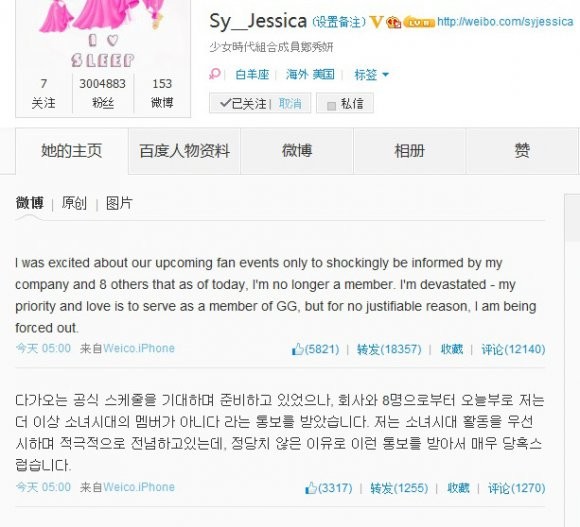 30일 오전 제시카의 웨이보에는 “다가오는 공식 스케줄을 기대하며 준비 하고 있었으나, 회사와 (나머지 멤버) 8명으로부터 오늘부로 저는 더 이상 소녀시대의 멤버가 아니다라는 통보를 받았습니다”, 이어 “저는 소녀시대 활동을 우선시하며 적극적으로 전념하고 있는데, 정당치 않은 이유로 이런 통보를 받아서 매우 당혹스럽습니다”라는 글이 한글과 영문으로 적혀 있다.