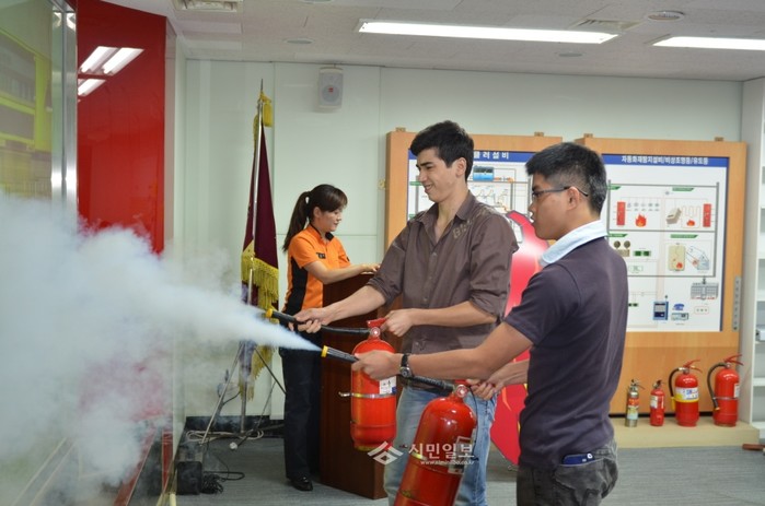 30일 강남소방서는 '온드림 가족 교육센터' 학생 20여명을 대상으로 심폐소생술, 방화복 입기, 소화기 체험 등 '소방안전교육'을 실시했다. 사진은 소화기를 사용하고 있는 학생들의 모습. (사진제공=강남소방서)