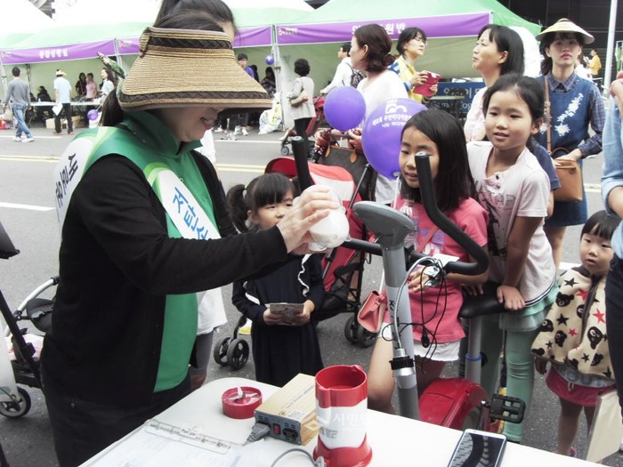 최근 인천시 남구는 '주안미디어문화축제' 기간 '우리구의 작은 실천 저탄소녹색생활'이란 주제로 '자전거 발전기 돌리기', '풍력하우스 만들기 ' 등 다양한 프로그램이 마련된 '기후변화체험 홍보부스'를 운영했다. 사진은 이날 홍보부스를 방문한 주민들의 모습. (사진제공=남구청)