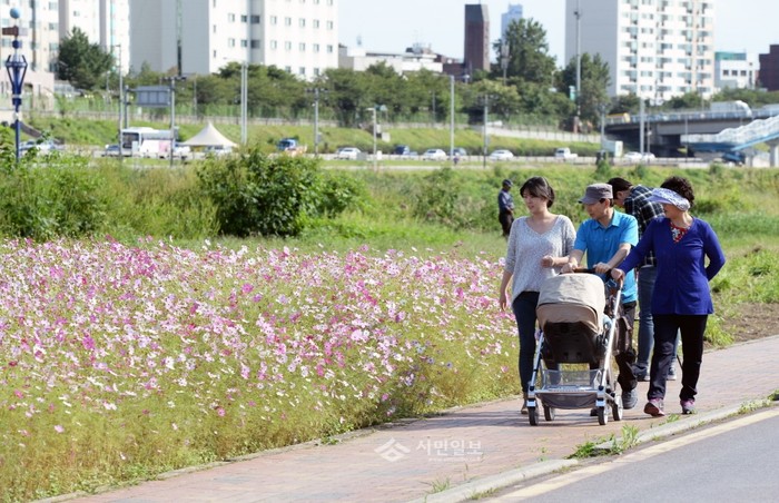 서울 동대문구를 지나는 중랑천에서는 지금 화창한 가을하늘 아래 꽃봉오리를 터트리기 시작한 코스모스와 수수한 빛깔의 억새밭이 시민들의 발길을 붙잡고 있다. 사진은 중랑천을 찾아 코스모스를 감상하는 시민들의 모습. (사진제공=동대문구청)