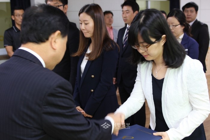 경기 아산교육지원청은 1일 오전 2층 특수지원센터 회의실에서 10월1일자 인사발령에 따른 '아산 지역내 전입 공무원 및 승진자에 대한 사령장 교부식'을 진행했다. 사진은 현재규 교육장(왼쪽)이 전지현 지방행정교육주사보에게 사령장을 수여하는 모습. (사진제공=아산교육지원청)