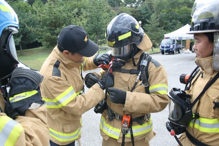 최근 경기 여주소방서는 여주시 멱곡동에 위치한 팬트론 공장을 대상으로 여주시청, 보건소, 여주경찰서 등 유관기관과 합동으로 '유관기관 합동 통제단 불시 출동훈련'을 실시했다. 사진은 훈련에 앞서 장비를 점검 중인 소방관들의 모습. (사진제공=여주소방서)