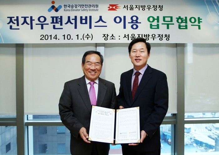 김기덕 서울지방우정청장(오른쪽)과 공창석 한국승강기안전관리원장(왼쪽)이 1일 서울 중구 포스트타워에서 우편물 발송 비용을 연간 약 1억2000만원 절감하는 '전자우편서비스 이용 업무협약'을 체결하고 기념촬영하고 있다. (사진제공=서울지방우정청)