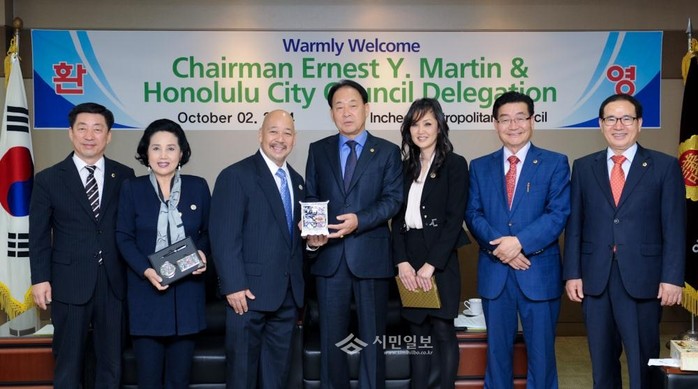 지난 2일 인천시의회를 방문한 어니스트 마틴 의장을 비롯한 미국 호놀룰루시의회 대표단이 인천시의회 의원들과 기념촬영을 하고 있다. 이날 시의회를 방문한 호놀룰루시의회 대표단은 양도시간 지속적인 상호우호교류 방안에 대해 논의했다. (사진제공=인천시의회)