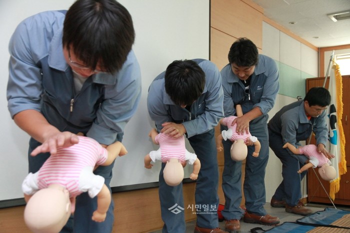 서울 구로소방서는 지난 1일 오전 9시 구로구에 위치한 강남도시가스㈜ 3층 강당에서 임직원 60여명을 대상으로 응급처치 실습교육을 실시했다. 사진은 이날 교육에 참석한 직원들의 '영유아 대상 하임리히법' 실습 모습. (사진제공=구로소방서)