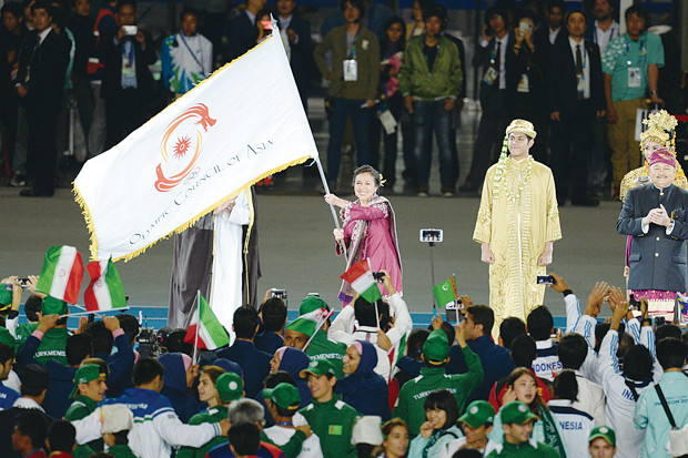 ‘아시아는 이제 인천을 기억할 것입니다.’라는 주제로 4일 오후 인천광역시 서구 인천아시아드 주경기장에서 진행된 ‘2014 인천아시아경기대회’ 폐회식에서 차기 아시안게임 개최지로 선정된 인도네시아 자카르타를 대표해 바수키 짜하야 푸르나마 자카르타 주지사가 대회기를 전달 받은 뒤 흔들고 있다.