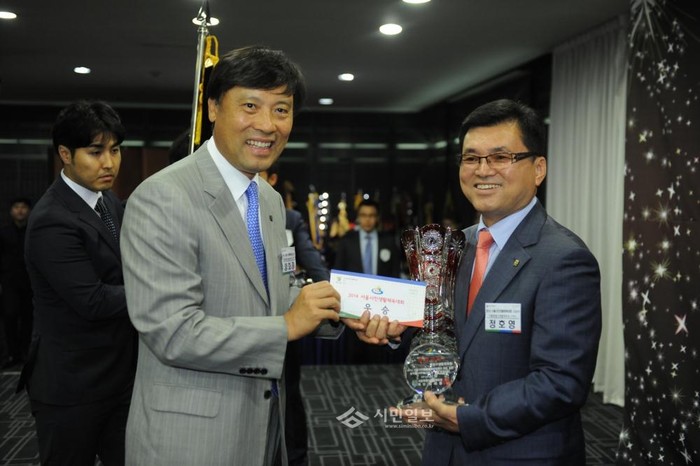 서울 중랑구가 최근 세종문화회관 세종홀에서 개최된 '2014 서울시민생활체육대회'에서 7년 연속 우승을 차지했다. 사진은 정호영 중랑구 생활체육회장(오른쪽)이 양회종 서울특별시 생활체육회장(왼쪽)으로부터 우승 트로피를 건네받는 모습. (사진제공=중랑구청)
