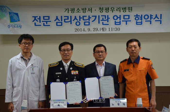 경기 가평소방서는 최근 소방서 회의실에서 가평군 청평면 소재 청평우리병원과 소방공무원의 스트레스 해소 및 정신건강 증진을 위한 업무협약을 체결했다. 사진은 업무협약을 체결하고 기념촬영을 하는 김옥식 가평소방서장과 노경태 청평우리병원 이사장의 모습. (사진제공=가평소방서)