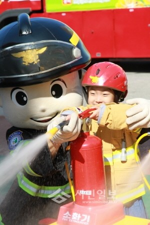 6일 오전 10시30분 고척근린공원에서 열린 서울 구로소방서의 '보고·느끼고·체험하는 119안전교실'에 참가한 아이빌어린이집 원생이 소방서 마스코트인 화동이와 함께 물소화기를 사용하고 있다. (사진제공=구로소방서)