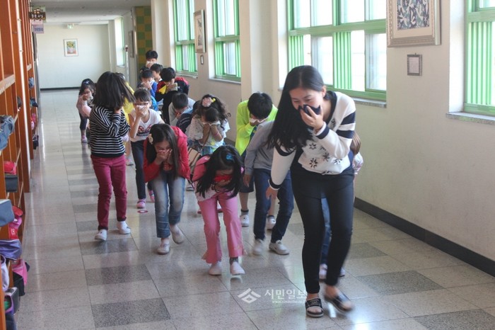 경기 부천시 동산초등학교는 6일 내동119 안전센터와 협조, 실제상황을 가정해 신속한 피난과 피난 유도를 통해 물적 피해를 최소화하고 전교직원 및 학생들의 소방안전의식을 고취하고자 '2014 소방안전훈련'을 실시했다. (사진제공=부천교육지원청)