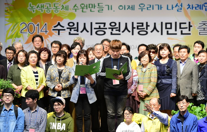6일 오전 경기 수원시청에서 열린 '수원시 공원사랑시민단 출범식'에서 참석자들이 봉사다짐 발표를 하고 있다. 2012년부터 시작된 ‘공원사랑시민단’은 시민 스스로의 자원봉사활동으로 공원을 깨끗하게 만들고, 꽃과 나무가 풍성하게 자랄 수 있도록 가꿔 나가는 시민봉사단체다.