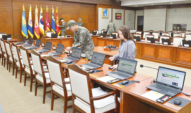 2014 국정감사를 하루 앞둔 6일 오전 서울 국방부 대회의실에 마련된 국정감사장에서 관계자들이 준비를 하고 있다.