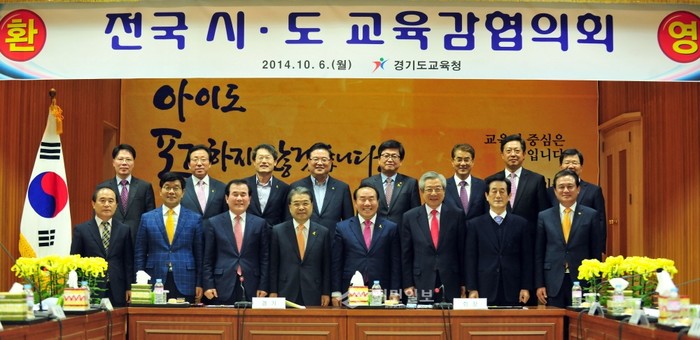 전국 시·도교육감들이 지난 6일 오후 3시 경기도 부천교육지원청에서 '전국 시·도교육감협의회' 임시총회를 열고 회의에 앞서 기념촬영을 하고 있다.