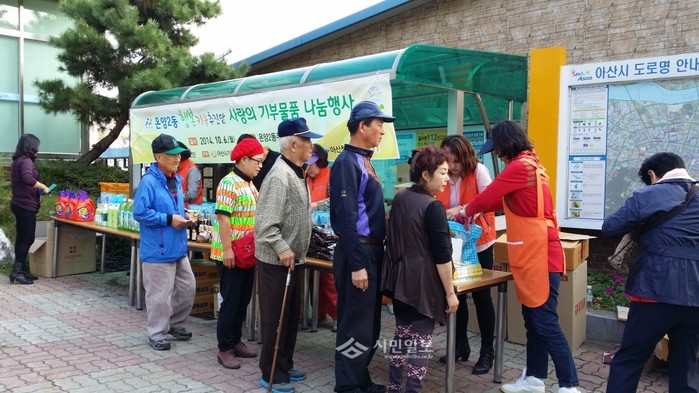 지난 6일 충남 아산시 온양2동 행복키움추진단이 온양2동 주민센터에서 지역내 복지 수준을 향상시키고 어려운 이웃을 돕기 위해 아산시 기초푸드뱅크와 연계해 기초생활보장수급자, 차상위계층, 한부모가정 구성원 등을 대상으로 물품을 나누고 복지종합상담창구를 운영했다. 사진은 행사 참여자들의 모습. (사진제공=아산시청)