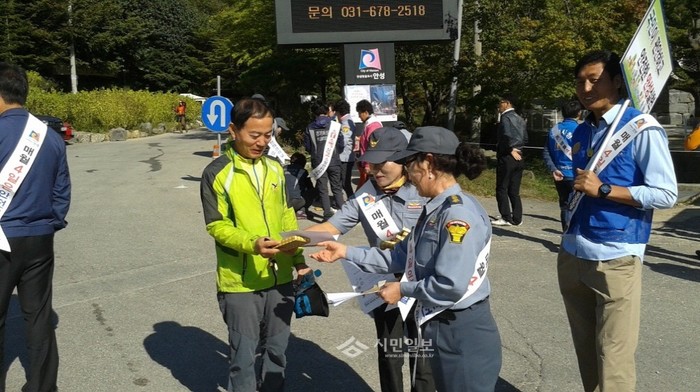 경기 안성시는 지난 6일 '제223차 안전점검의 날'을 맞아 서운면 청룡사 등산로 입구에서 '산불예방 및 가을철 안전한 산행 요령'이라는 주제로 캠페인을 실시했다. 사진은 캠페인에 참여한 공직자들이 등산로 등에서 발생할 수 있는 각종 안전사고에 대한 대비요령 및 유의사항을 전파하는 모습. (사진제공=안성시청)