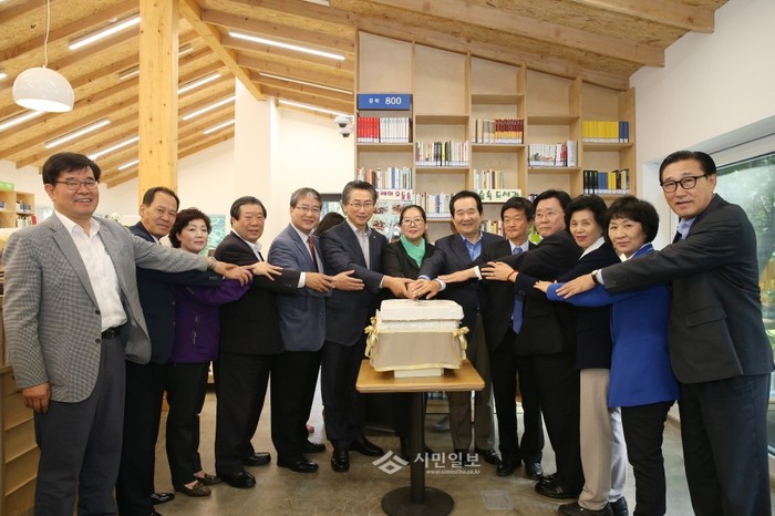 서울 종로구의회 의원들이 지난 4일 북촌에 거주하는 마을 주민들이 마을공동체 협동조합을 결성해 운영하는 '삼청공원 숲속도서관'의 개관 1주년 기념행사에 참석해 축하 케이크를 자르고 있다.(사진제공=종로구의회)