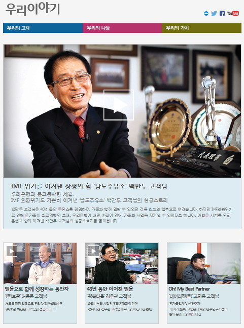 우리은행에 따르면 '우리이야기'는 우리은행과 오랜 기간 거래하게 된 고객들의 인연, 성공담 등 동반성장 스토리를 소개하는 사이트이다.