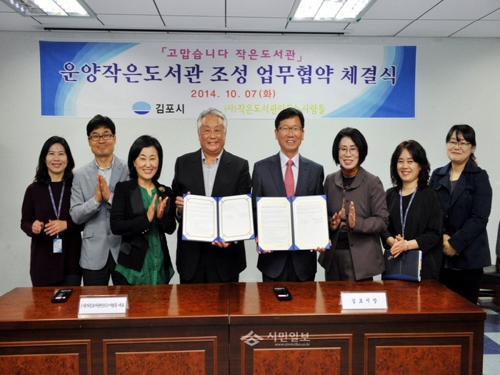 경기 김포시와 '(사)작은도서관만드는사람들'은 지난 7일 김포시청에서 유영록 김포시장, 김수연 (사)작은도서관만드는사람들 대표 등 관계자 10여명이 참석한 가운데 '운양작은도서관 조성을 위한 업무협약'을 체결했다. 사진은 이날 참석한 유 시장 외 관계자들의 기념촬영 모습. (사진제공=김포시청)