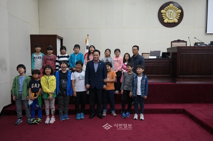 경기 안성시는 지난 7일 양성초등학교 3·4학년 학생 33명을 대상으로 시청·시의회 등을 견학하는 '생생체험! 안성시청!'을 실시했다. 사진은 안성시의회 유광철 의장과 견학 프로그램에 참가한 학생들의 모습. (사진제공=안성시청)